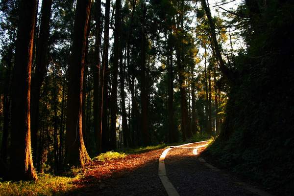 這條古道路況很好,兩旁都是人造林,在清晨微曦的陽光中,吸著乾爽香甜的空氣,全身舒暢,毫無寒意。