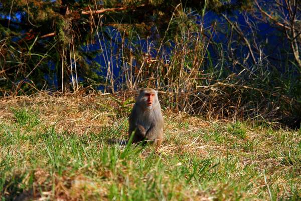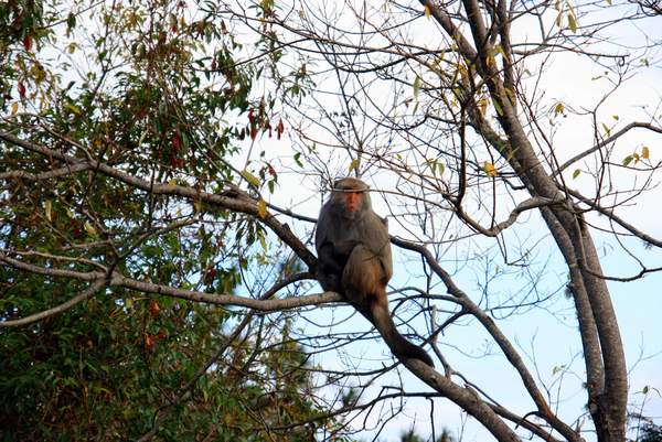 彌猴大約五、六隻,只有一隻在路旁,其他都躲在樹上。