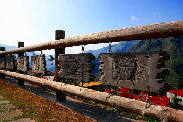 街道欄杆陳列多幅木頭浮雕,展現特富野濃濃的原鄉風味。