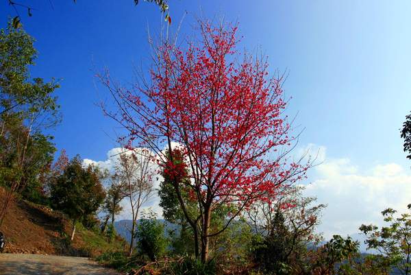 歲末時節,在阿里山公路上不見楓樹,卻隨處可見火紅的山櫻花,難道是春來早了嗎。